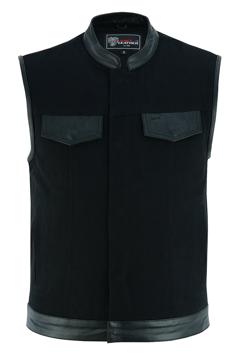 The Vance VB914L Denim Black Club Vest with Leather trims is a high-quality and stylish vest designed for motorcycle riders of all ages. This vest is true to size, ensuring a perfect fit for any body type. The preacher collar club style vest has covered snaps and a hidden zipper, providing a sleek and streamlined look.