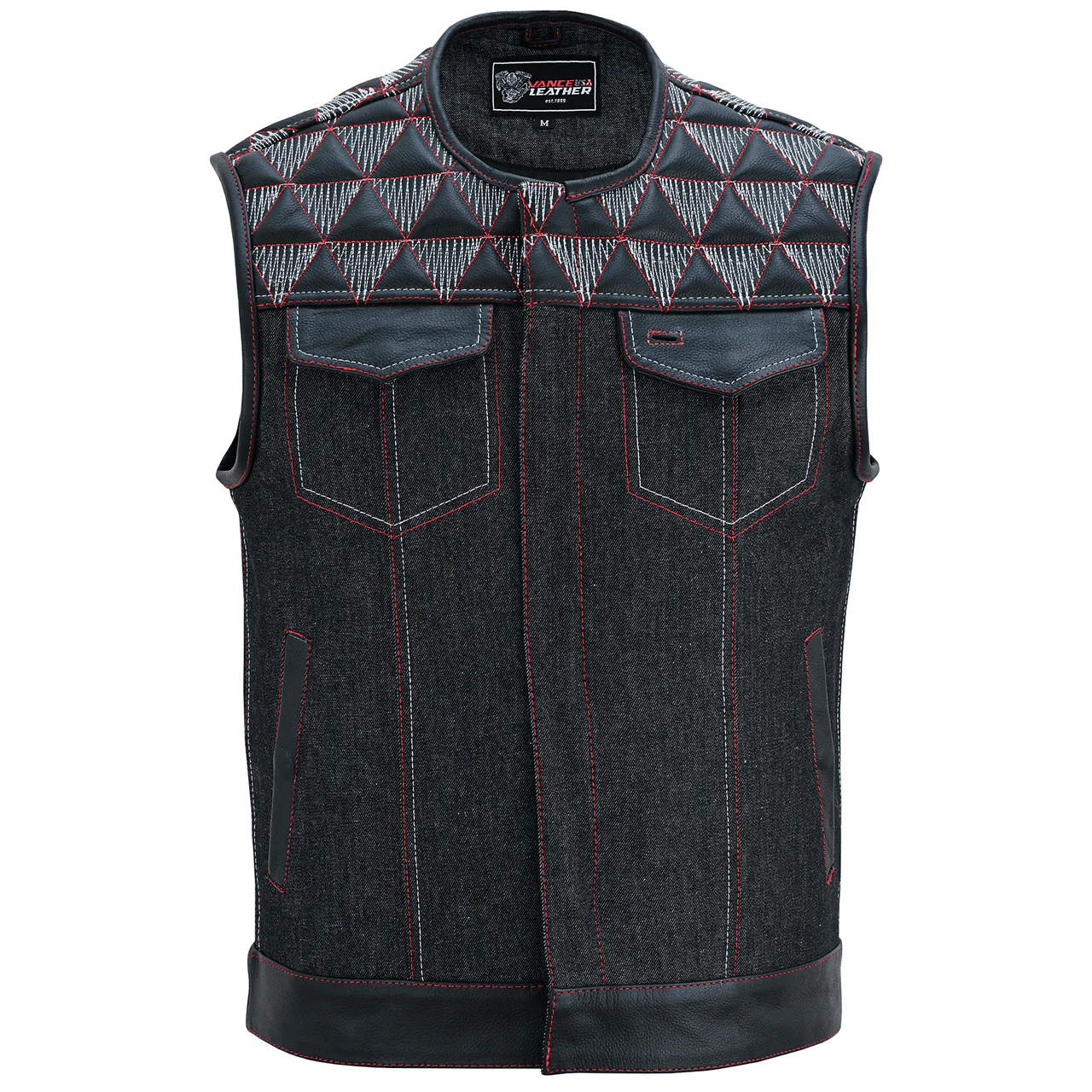 Men's Denim & Leather Motorcycle Vest with Conceal Carry Pockets, SOA Biker Club Vest Red & White Stitching