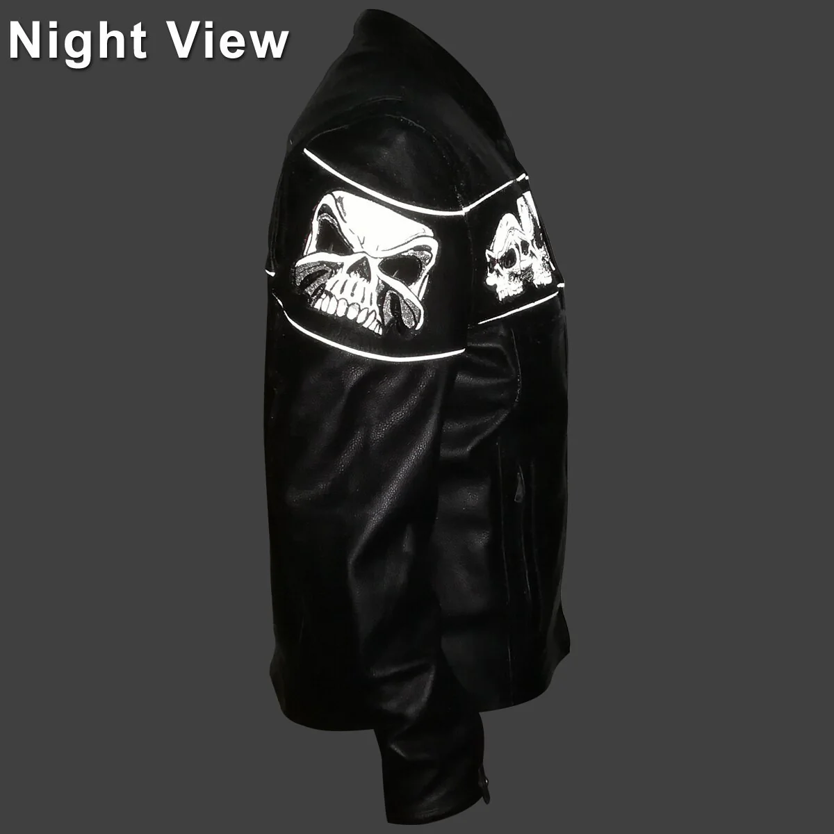 The Reflective Skull Leather Motorcycle Jacket is a must have for the riders who love the combination of sporty and cruiser. This jacket has a distinct reflect skull design on the front and back which will definitely make you stand out in the crowd; especially at night.
