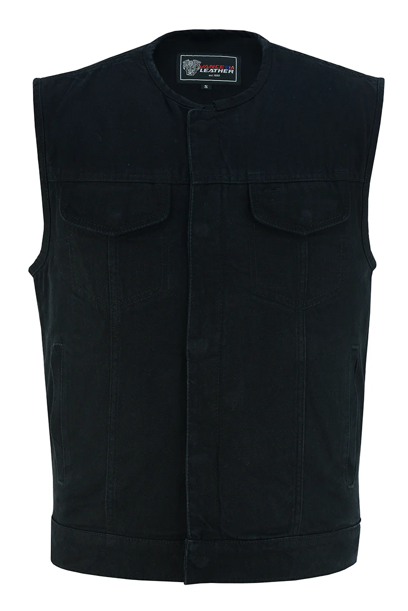 The Vance Men's Black Denim Collarless Motorcycle Vest is the perfect addition to any biker's wardrobe. Made from high-quality denim, this vest is both durable and comfortable to wear. It features a fully lined interior and adjustable bottom, providing a custom fit that will stay in place while you ride.